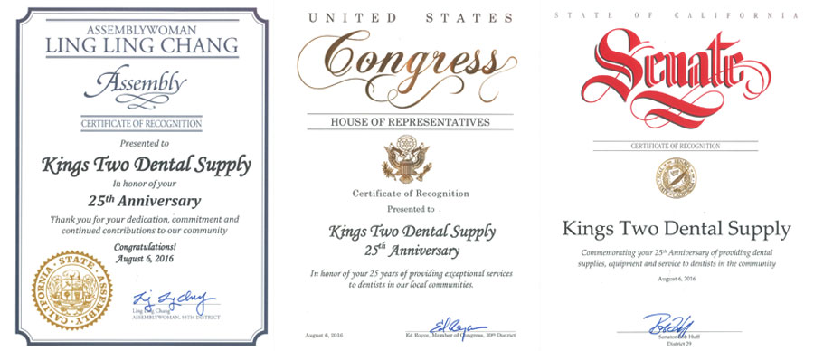 by Senator Bob Huff for company accomplishment at Kings Two 25th Anniversary.